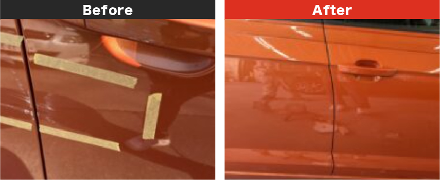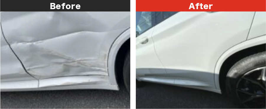 ドアの中央を走る「プレスライン」と呼ばれる、車のデザイン上重要な部分にへこみができてしまったケースです。プレスラインの修理は非常に難易度が高く、一般的な板金工場では交換を勧められることもあります。しかし、池内自動車の熟練の職人は、特殊な工具と長年の経験を活かし、ミリ単位でプレスラインを正確に再現。元のシャープなラインを取り戻し、ドア全体の美しさを復活させました。